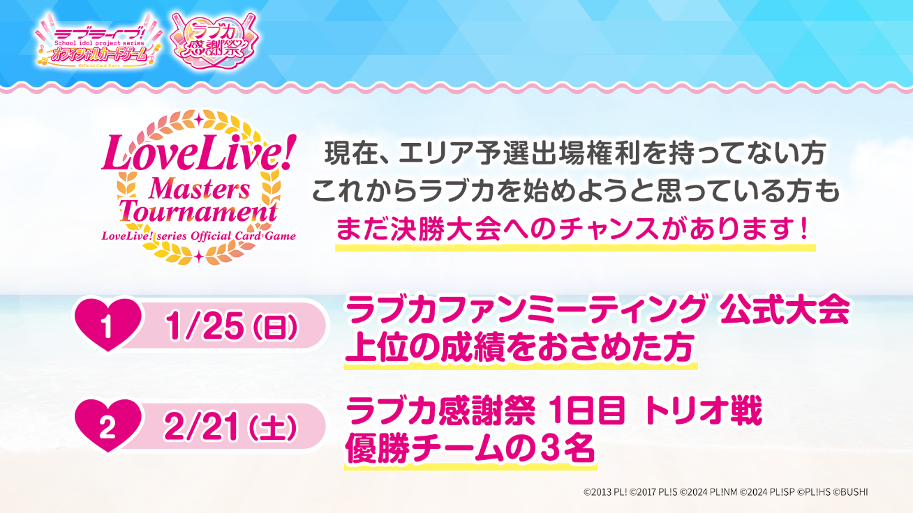 その他ラブライブ!シリーズ オフィシャルカードゲームの情報についてはラブカ公式サイトまたはラブカ公式 X にて詳細をご確認ください。