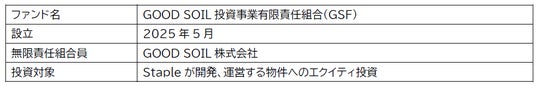 三井住友信託銀行株式会社とStapleが共同で設立した「GOOD SOIL株式会社」が運用する、地域経済の持続的な発展と資金循環を目的としたファンドです。地域に根ざした小規模かつ連続的な不動産開発や、遊休不動産の再生を資金面から支援し、経済的リターンと社会的インパクトの両立を目指しています。