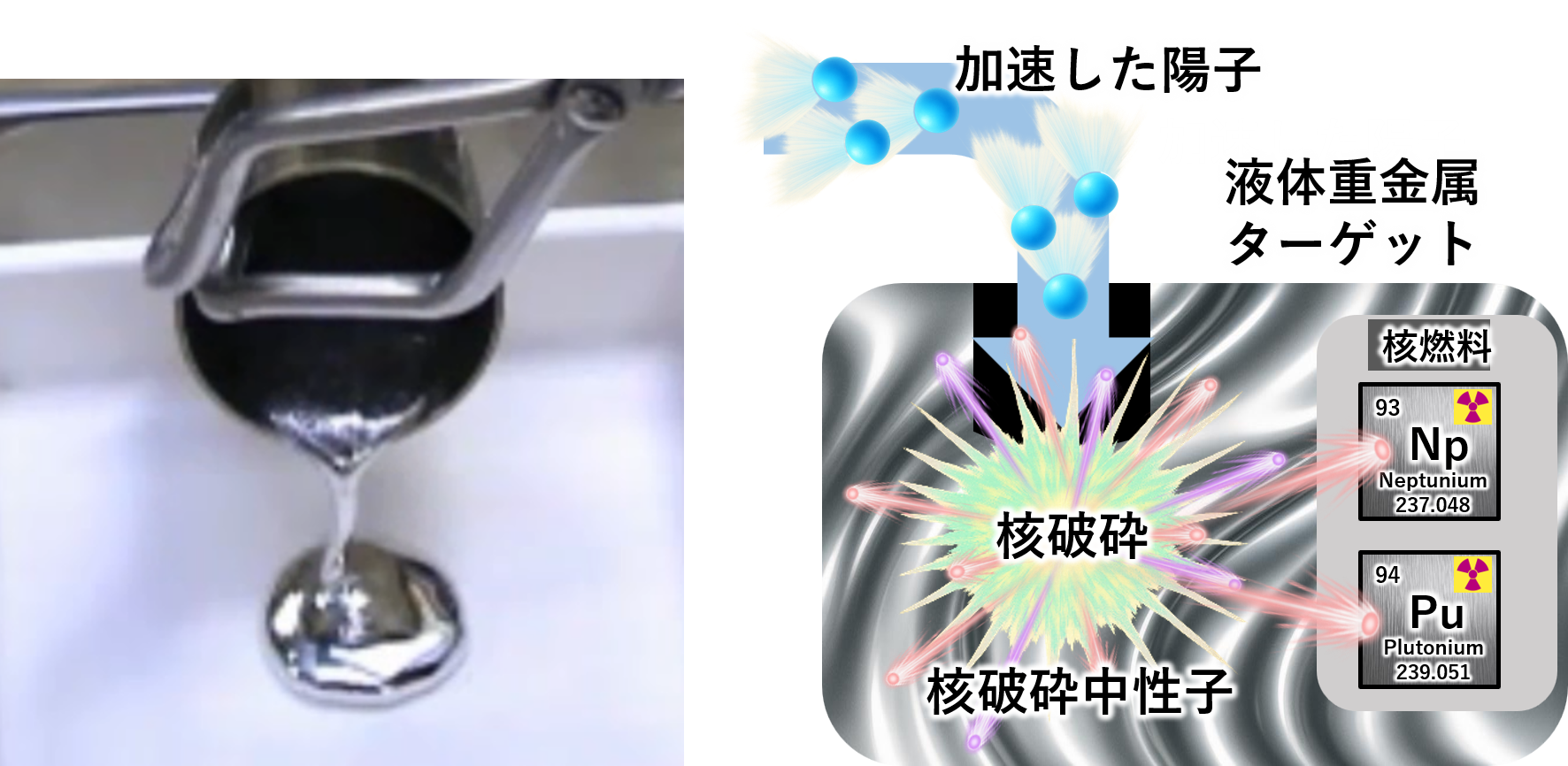 左:ADSで使用される液体重金属のイメージ写真 、右:加速した陽子を照射した液体重金属ターゲットの核破砕反応と中性子によるマイナーアクチニドの核変換