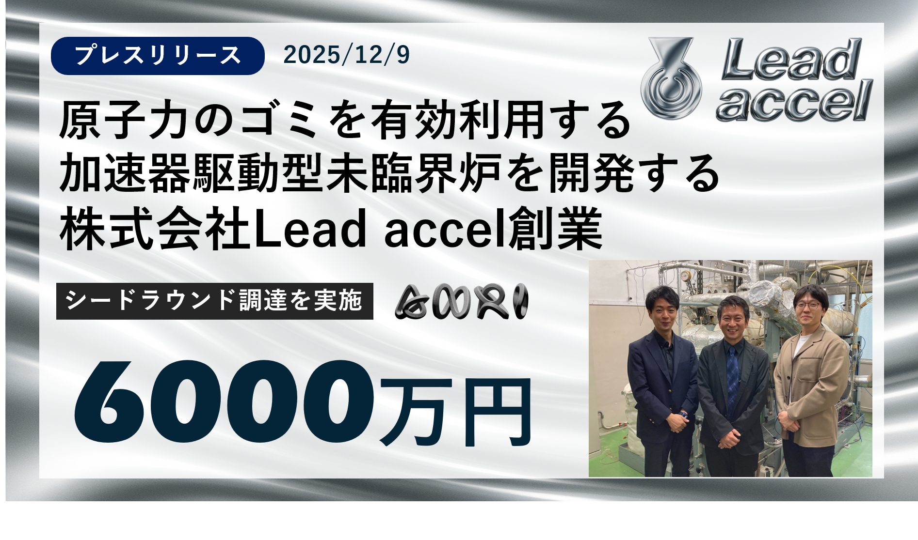 当社の代表取締役の近藤正聡は、創業前よりベンチャーキャピタルANRIの鮫島昌弘氏と連携しながら、事業構想と準備を進めてまいりました。その取り組みが評価され、『世界を変える大学発スタートアップを育てる』ことを掲げるプラットフォームGreater Tokyo Innovation Ecosystem (GTIE)のGAPファンドプログラム<エクスプロール2年>に採択され、創業に向けた支援を受けることができました。この度、ANRI-GREEN1号投資事業有限責任組合より資金調達を実施し、東京科学大学で培ってきた液体重金属技術を基盤としたADSの実現に向けて、さらなる開発と社会実装に尽力してまいります。
