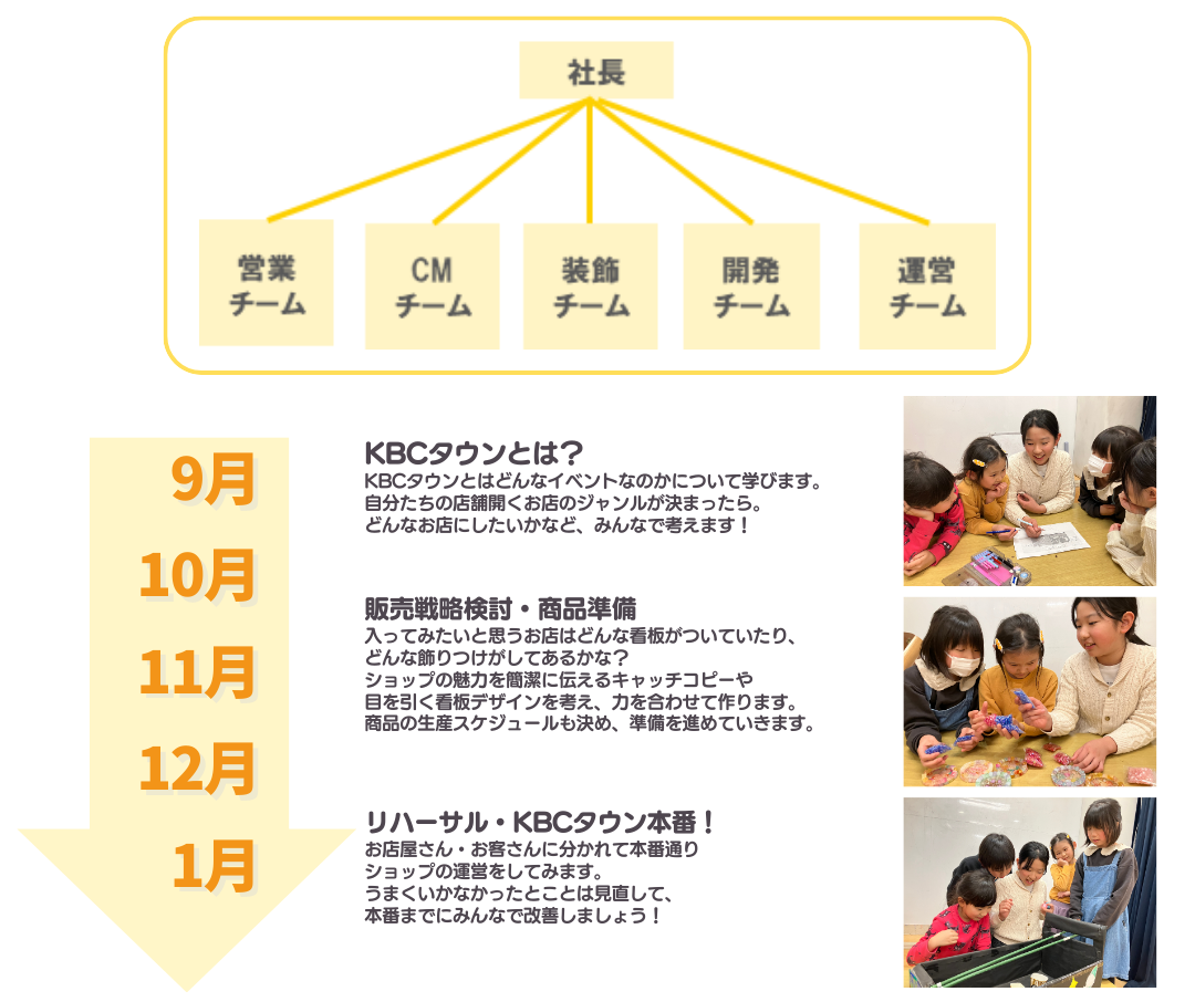 16回目を迎える本イベントは、過去最多となる23企業の協賛を得て実施することとなりました(別紙参照)。会場にはKBC22店舗の小学生が準備した25種類の模擬店がオープン。小学1~6年生が協力し、売上目標を設定したり、店長・副店長・販促・広報・営業など企業さながらの役割分担を行い約半年間かけ準備いたしました。