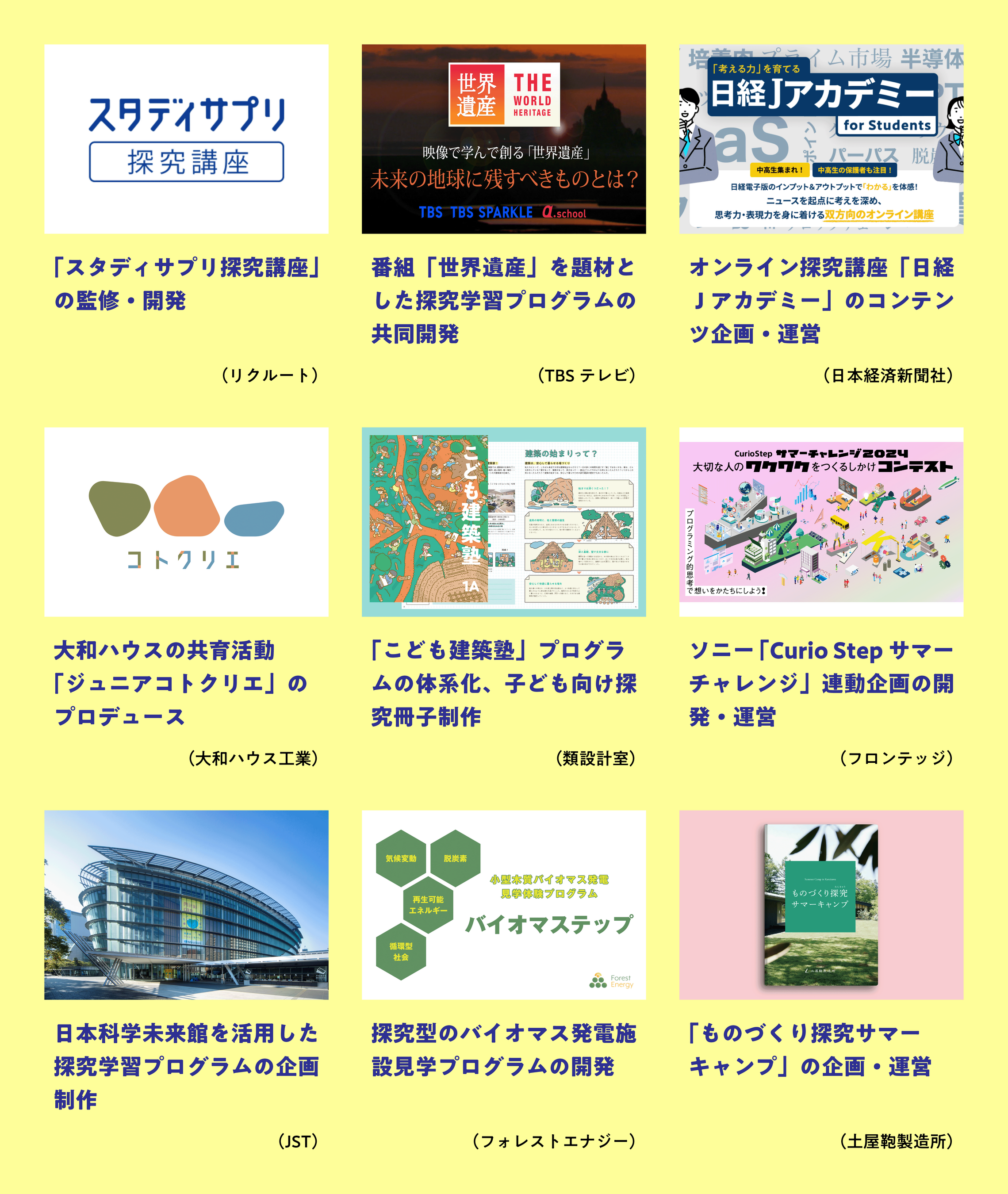 エイスクールはこれまで12年にわたり、大手教育企業やメーカー、メディア企業、建築・不動産企業、社会教育施設、中央省庁、自治体、財団などのさまざまなパートナーとともに、探究学習プログラムや教材の企画開発、学びの場づくり、新たな教育サービスの立ち上げなど、数多くの共創プロジェクトを手がけてきました。