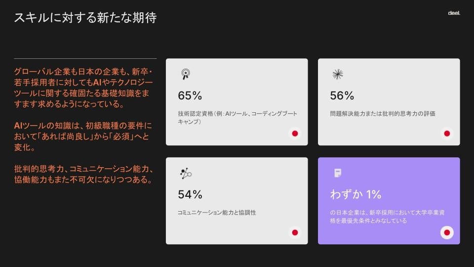 AIは、日本の「働き方」「採用」、そして「グローバルな競争力」を再定義しています。 あらゆる業界で、主要企業は従来の「学歴・資格主義」から、「スキルベースの採用」や「継続的な学習文化」へと移行しています。 この変革は、生産性、創造性、そしてグローバルな競争力を加速させています。 国境を超えて才能(タレント)と機会をつなぐプラットフォームとして、Deelは、日本企業が人とテクノロジーが共に成長し、より強くなれる「仕事の未来」を築くことを支援することに尽力しています。