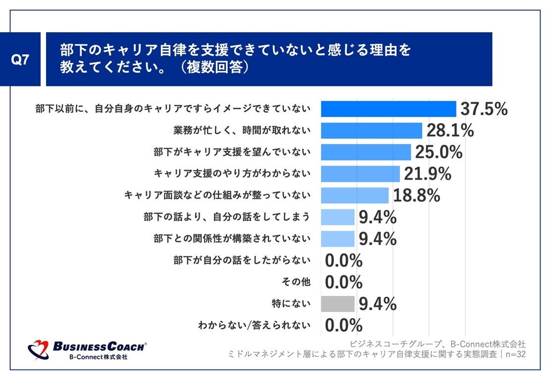 Q3で「50点以下」と回答した方に、「Q7.部下のキャリア自律を支援できていないと感じる理由を教えてください。(複数回答)」(n=32)と質問したところ、「部下以前に、自分自身のキャリアですらイメージできていない」が37.5%、「業務が忙しく、時間が取れない」が28.1%、「部下がキャリア支援を望んでいない」が25.0%という回答となりました。