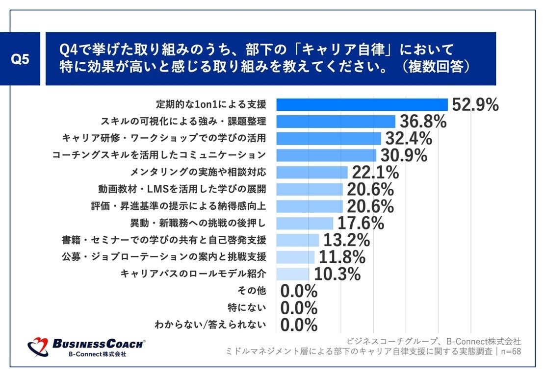 Q4で「特にない」「わからない/答えられない」以外を回答した方に、「Q5.Q4で挙げた取り組みのうち、部下の「キャリア自律」において特に効果が高いと感じる取り組みを教えてください。(複数回答)」(n=68)と質問したところ、「定期的な1on1による支援」が52.9%、「スキルの可視化による強み・課題整理」が36.8%、「キャリア研修・ワークショップでの学びの活用」が32.4%という回答となりました。