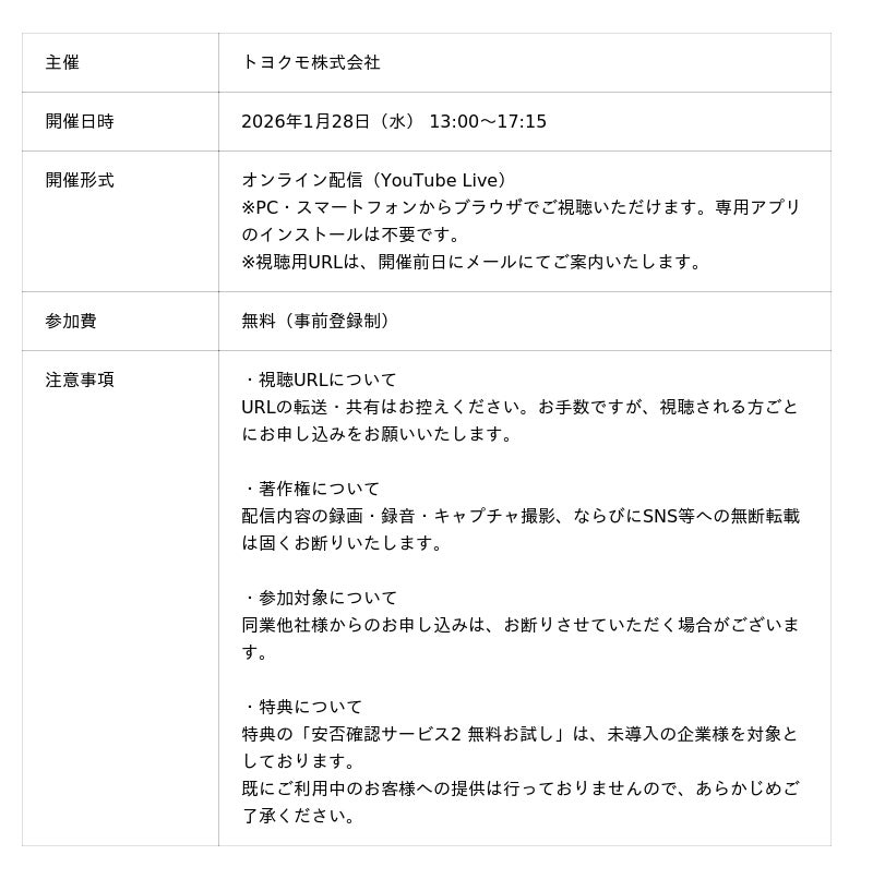誰でも簡単に使えるビジネス向けのクラウドサービスを提供するトヨクモ株式会社(本社:東京都品川区、代表取締役社長:山本 裕次、以下トヨクモ)は、企業の経営者や防災・BCP(事業継続計画)担当者を対象としたオンラインカンファレンス「トヨクモ防災DAY 2026」を、2026年1月28日(水)に開催いたします。