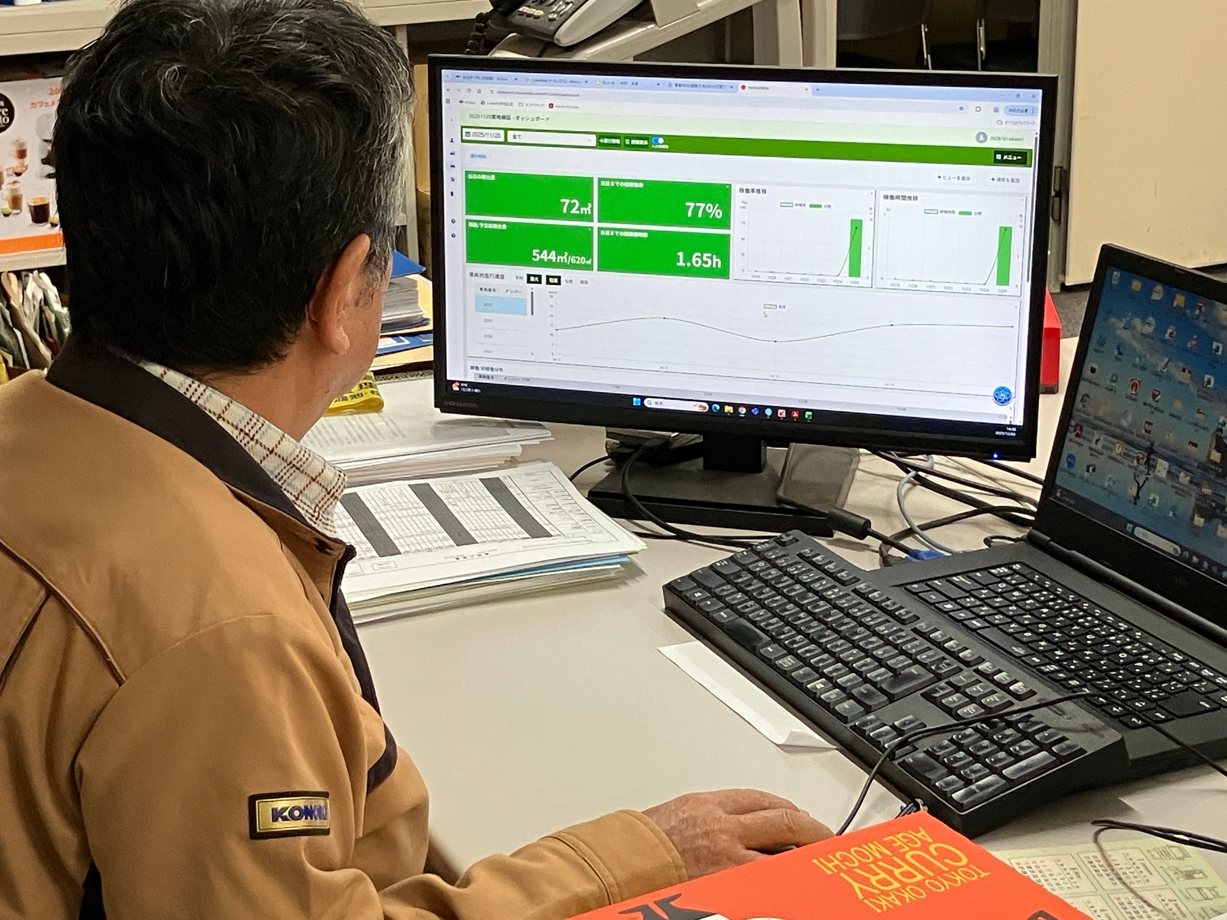 建設現場のリアルタイムな工程改善、土運搬作業とそれに付随する検査業務の効率化を図り、抜本的な生産性向上を実現します。また、実績と計画の差異を一目で確認でき、適切な工程管理が可能となります。