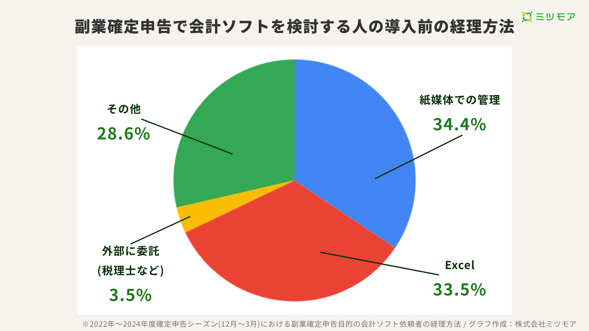 - 副業確定申告を行う人のうち、約7割が紙・Excelで経理を管理