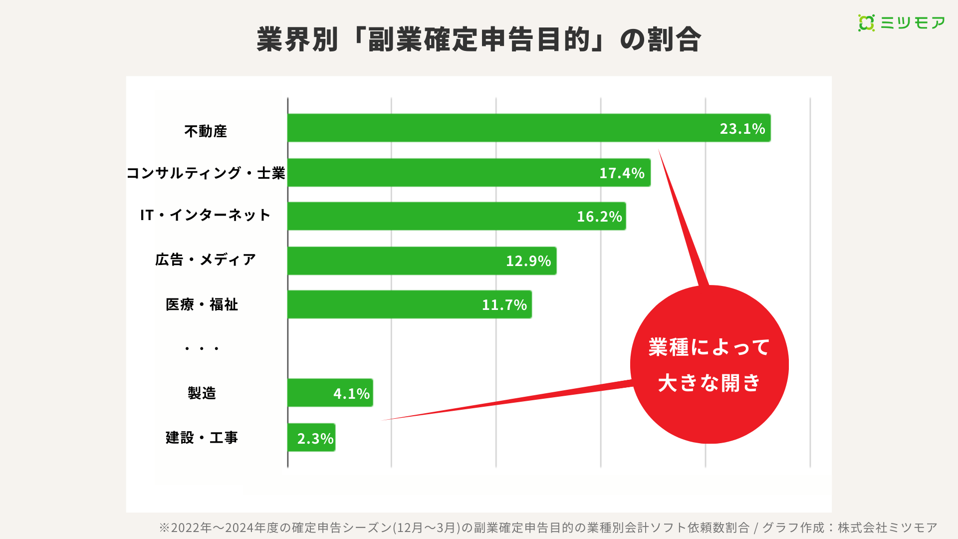 副業確定申告を行う人の本業の割合を業界別に見ると、不動産業界が23.1%で最も高い。一方、建設・工事業界は2.3%、製造業は4.1%と業界ごとの差が明確に