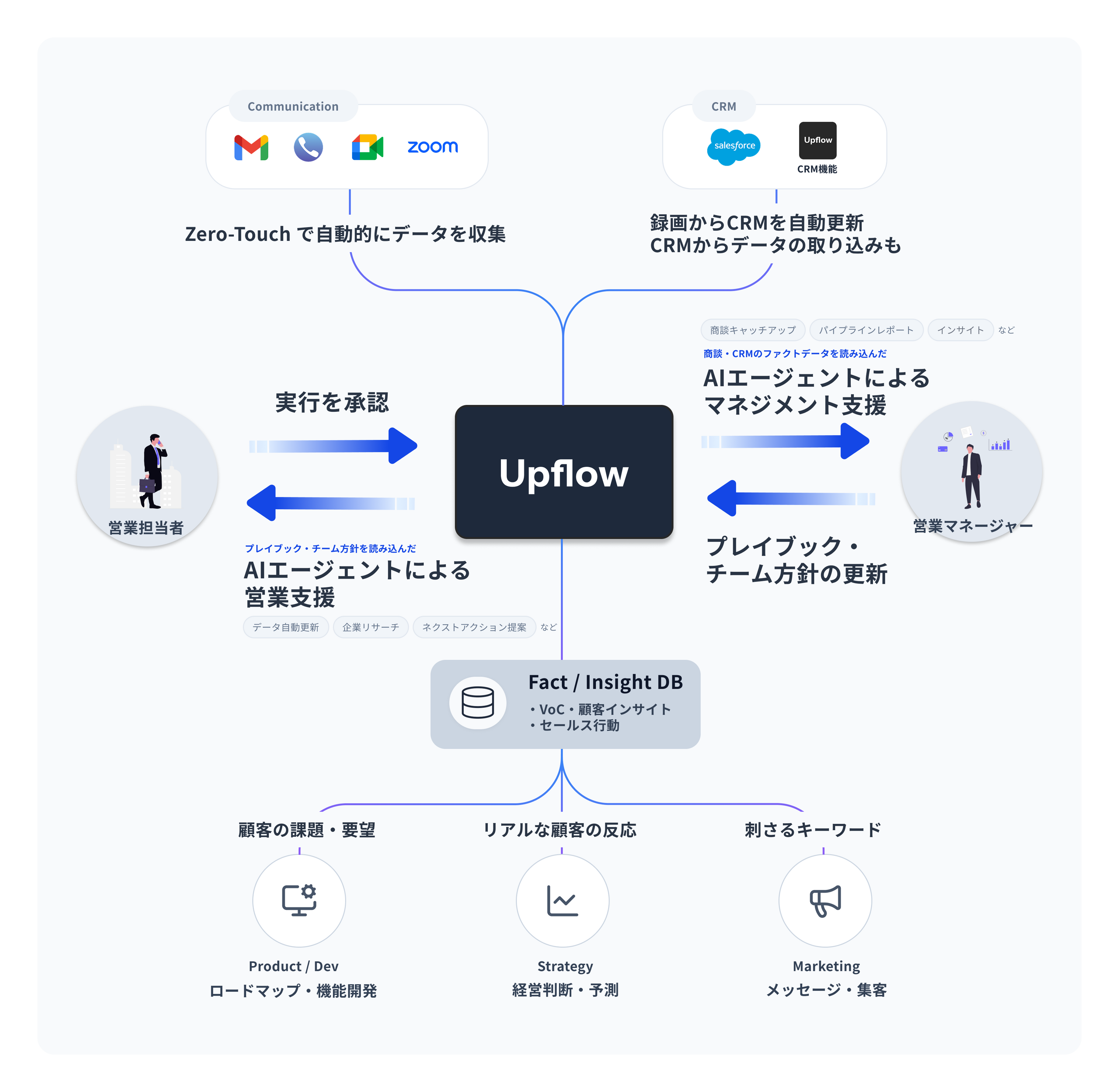Upflowは、BtoB企業の営業組織において、数字だけでは見えない「商談の中身」から、売れるチームをつくる営業マネージャーのためのAIエージェントです。