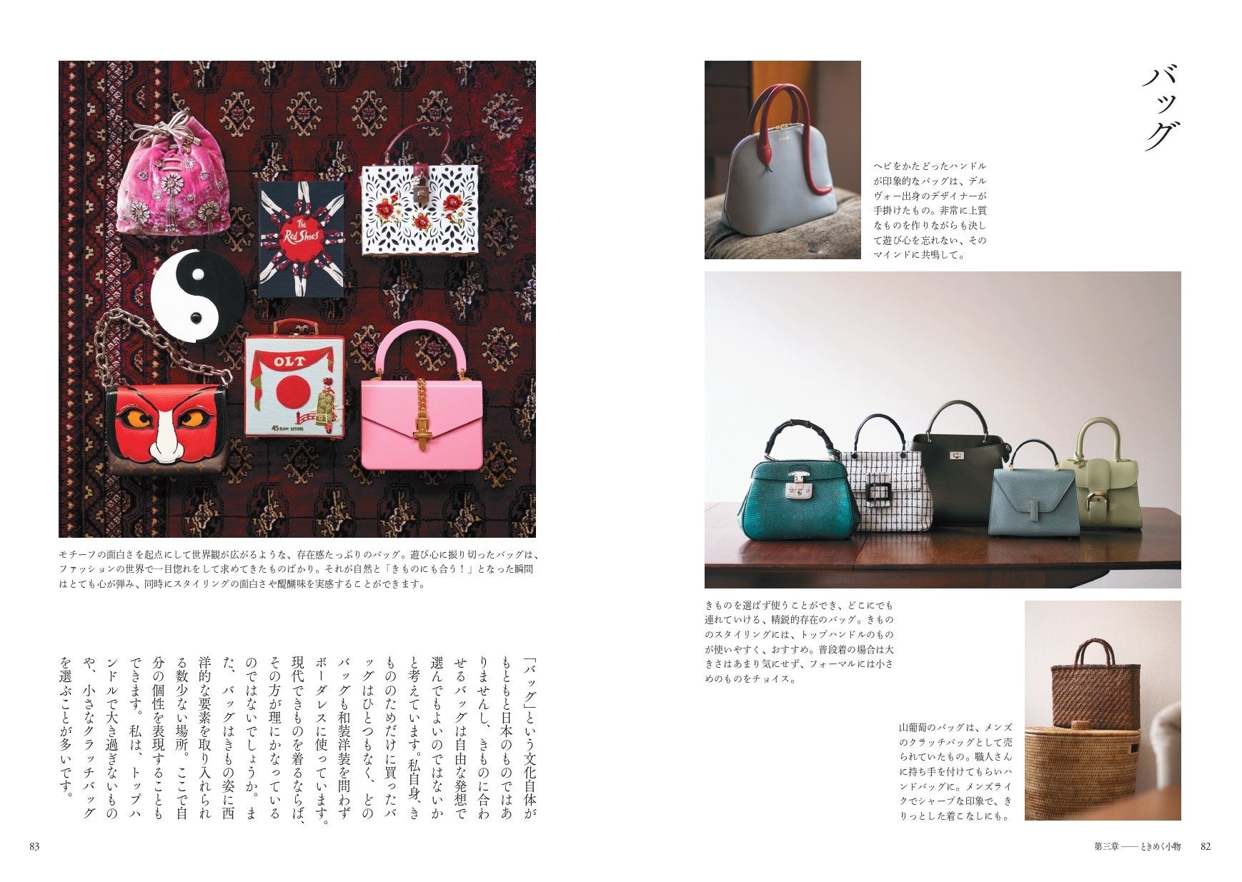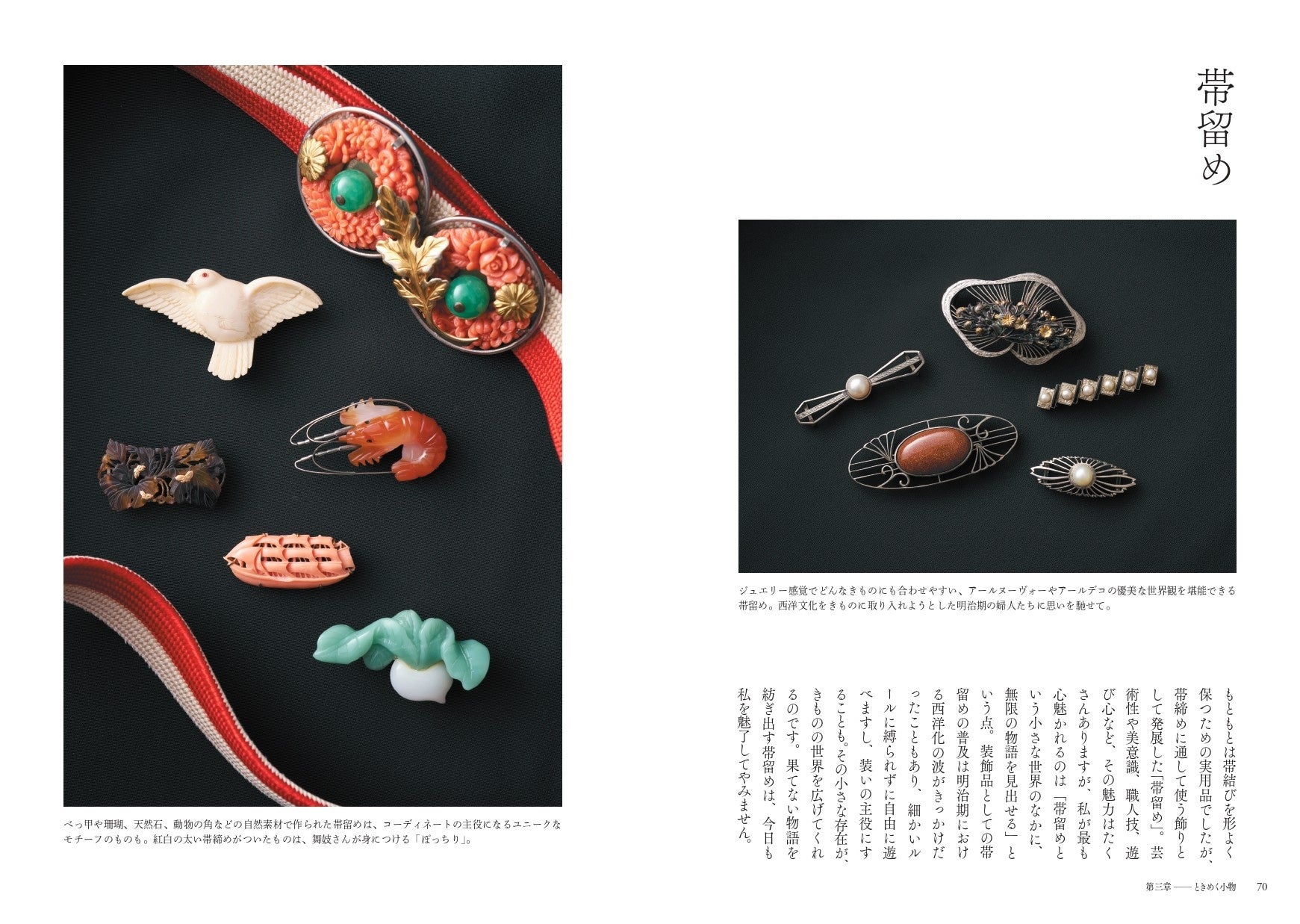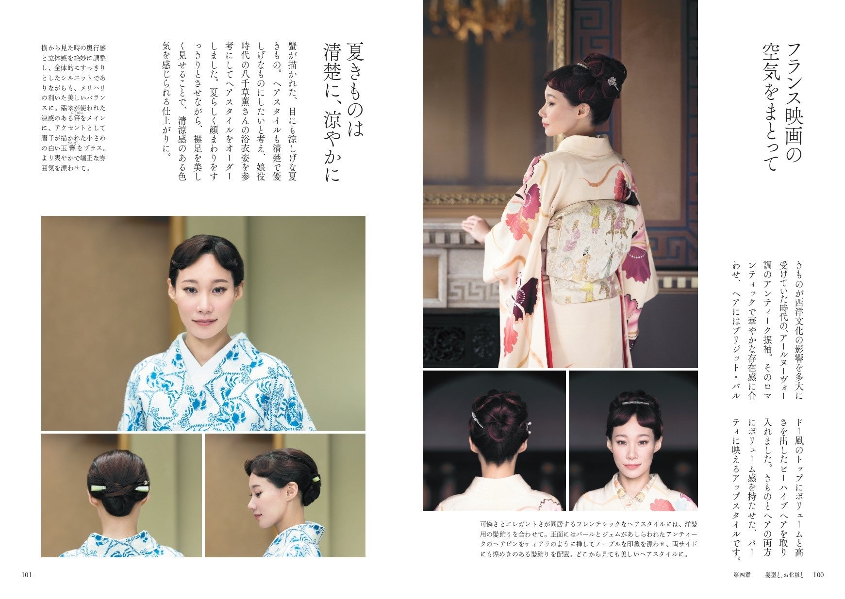 帯留めやバッグ、草履などの小物合わせ、大好きな映画や銀幕のスターをイメージした髪型など、ユリア流のきものスタイルを作るうえで欠かせないエッセンスもご紹介。特に「きもの姿はヘアスタイルで50%決まる」と語るユリアさんの、きものに合わせたヘアスタイルカタログは必見です。