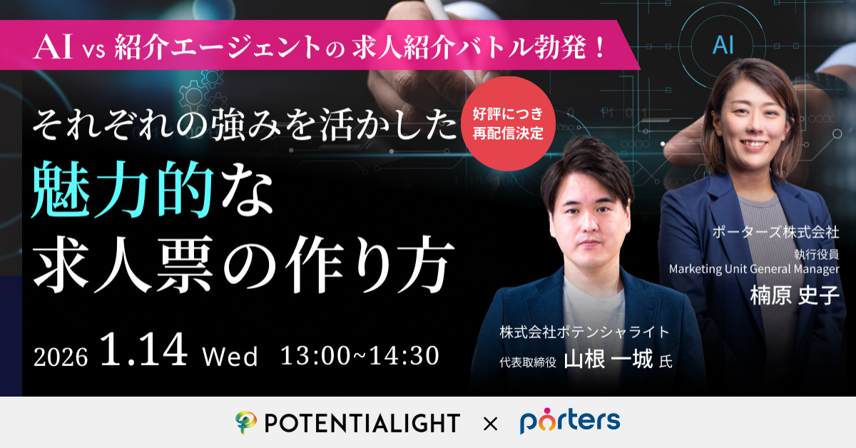 人材ビジネス向けマッチングシステムを提供するポーターズ株式会社(東京証券取引所グロース.証券コード5126、東京都港区、代表 西森 康二)は、「AI vs 紹介エージェントの求人紹介バトル勃発!それぞれの強みを活かした魅力的な求人票の作り方」の再配信を2026年1月14日(水)13:00~行います。
