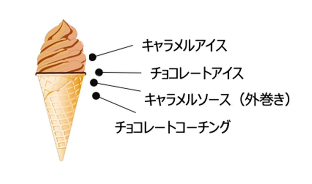 一口目から最後までキャラメル感を味わえる仕立てを目指し、コーンの下からアイスの上までキャラメルソースを巻いているのが特長です。2022年のコラボ開始から改良を続けてきたこだわりのソース。アイスの食べ始めから食べ終わりまで、キャラメルの濃厚な風味が口いっぱいに広がります。