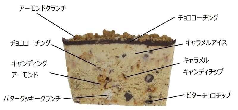 蓋を開けると、キャラメルアイスをチョコレートでたっぷりと覆い、その天面にアーモンドクランチをびっしりと敷き詰めています。「N.Y.リッチスカッチサンド&Wチョコレート」ならではのビター感とアーモンドの風味、食感をダイレクトに表現しました。キャラメルアイスと一緒に口に運ぶと、ふわりとチョコの香りが広がり、追いかけるようにキャラメルのコクが広がります。香りも甘みも贅沢に重なる奥行きのある仕上げです。