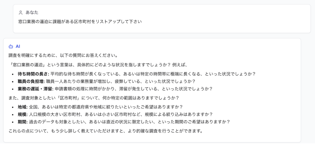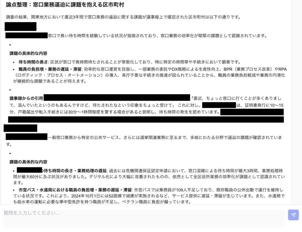 以下、「窓口業務の逼迫に課題がある区市町村」をディープリサーチした例
