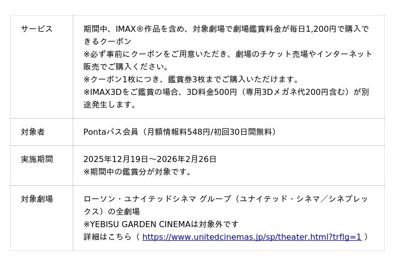 KDDIは、約1,500万人が利用しているおトクなサブスクリプションサービス「Pontaパス」(月額548円)の映画鑑賞クーポン「シアター割」の提供10周年を記念し、IMAX(R)も含め映画が期間中いつでも1,200円(大人料金の場合)で鑑賞できる「ローソン・ユナイテッドシネマ グループ シアター割10周年キャンペーン」(以下 本キャンペーン)の第2弾を、2025年12月19日から2026年2月26日まで開催します。