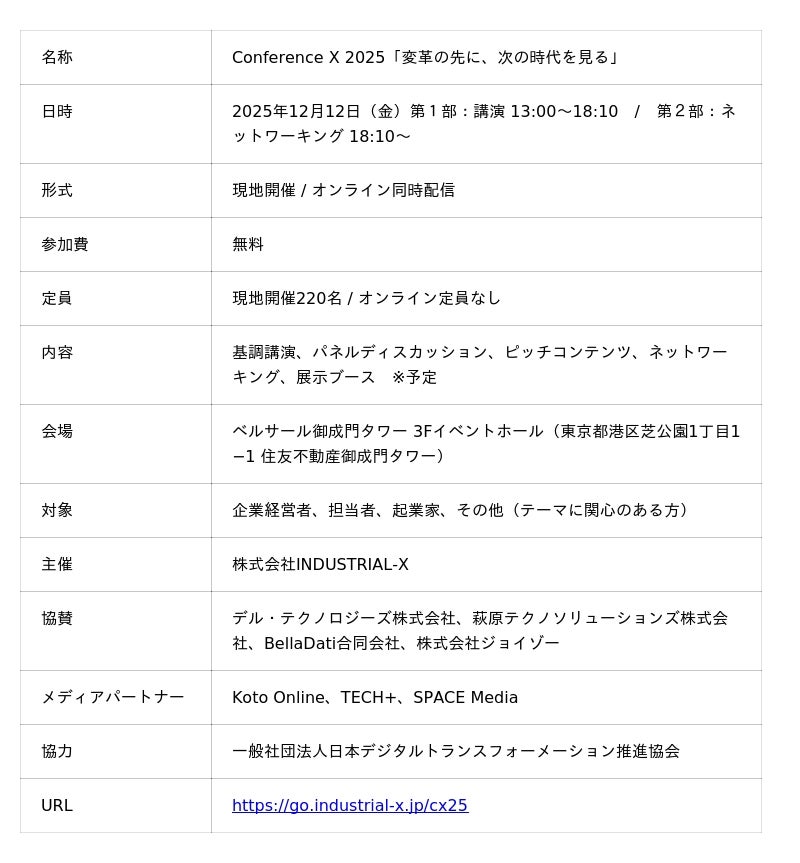 本カンファレンスは、株式会社INDUSTRIAL-X(本社:東京都港区、代表取締役CEO:八子知礼)が主催し、経営・事業・現場の視点を横断して、日本を代表する経営者や最先端の変革事例に直接触れられる場として、すでに累計登録者5,000名を突破している注目のイベントです。
