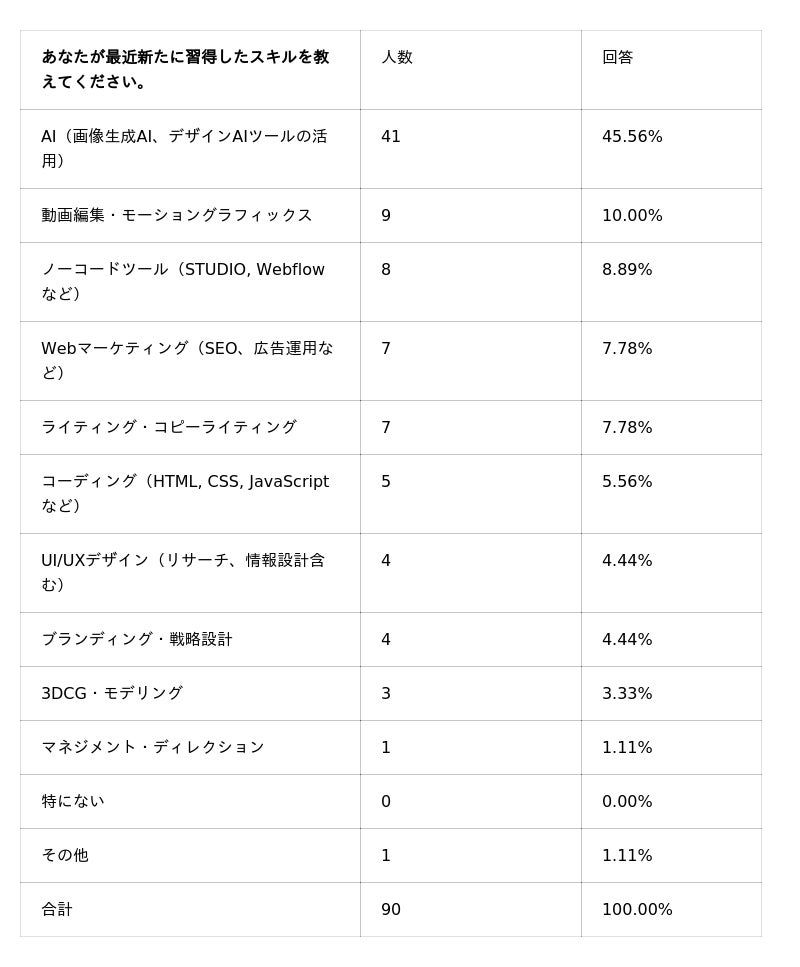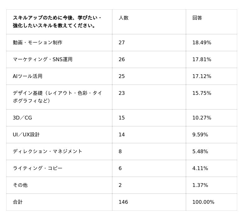 実際、AIスキルが急速に普及した影響で、まずは「日々の制作を時短すること」が優先され、結果として動画・3D・コーディングのような学習コストの高いスキルは後回しになりやすい状況が推察されます。