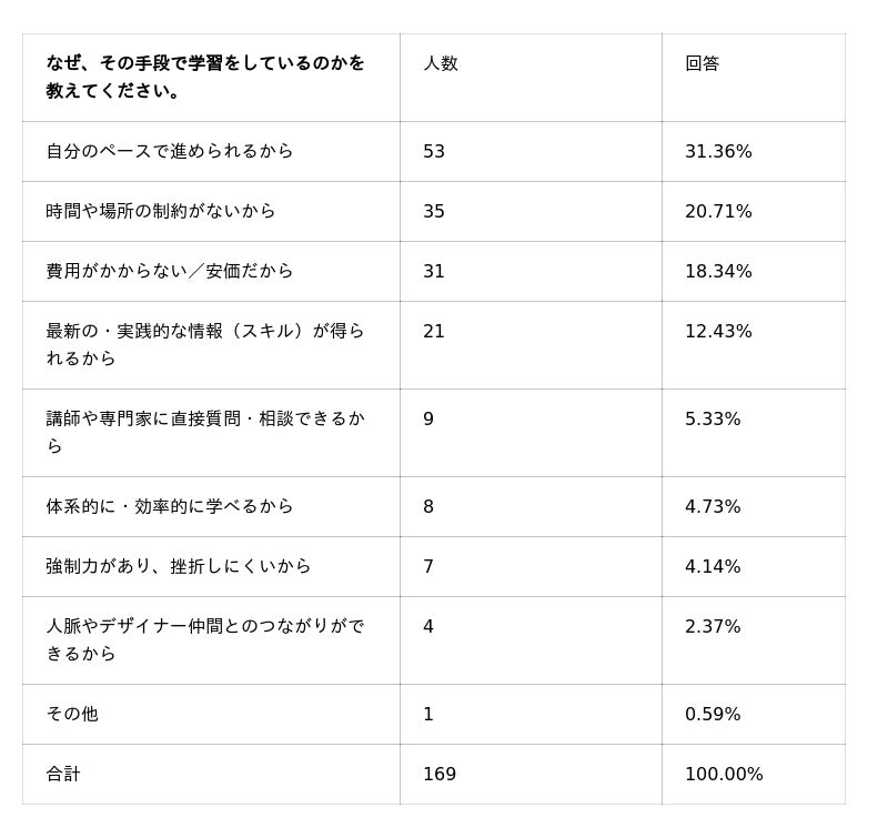 これらの傾向から、独学が多く選ばれた理由としては、「柔軟性・コスト」といった価値が合わさった学習方法であるからであると推察されます。