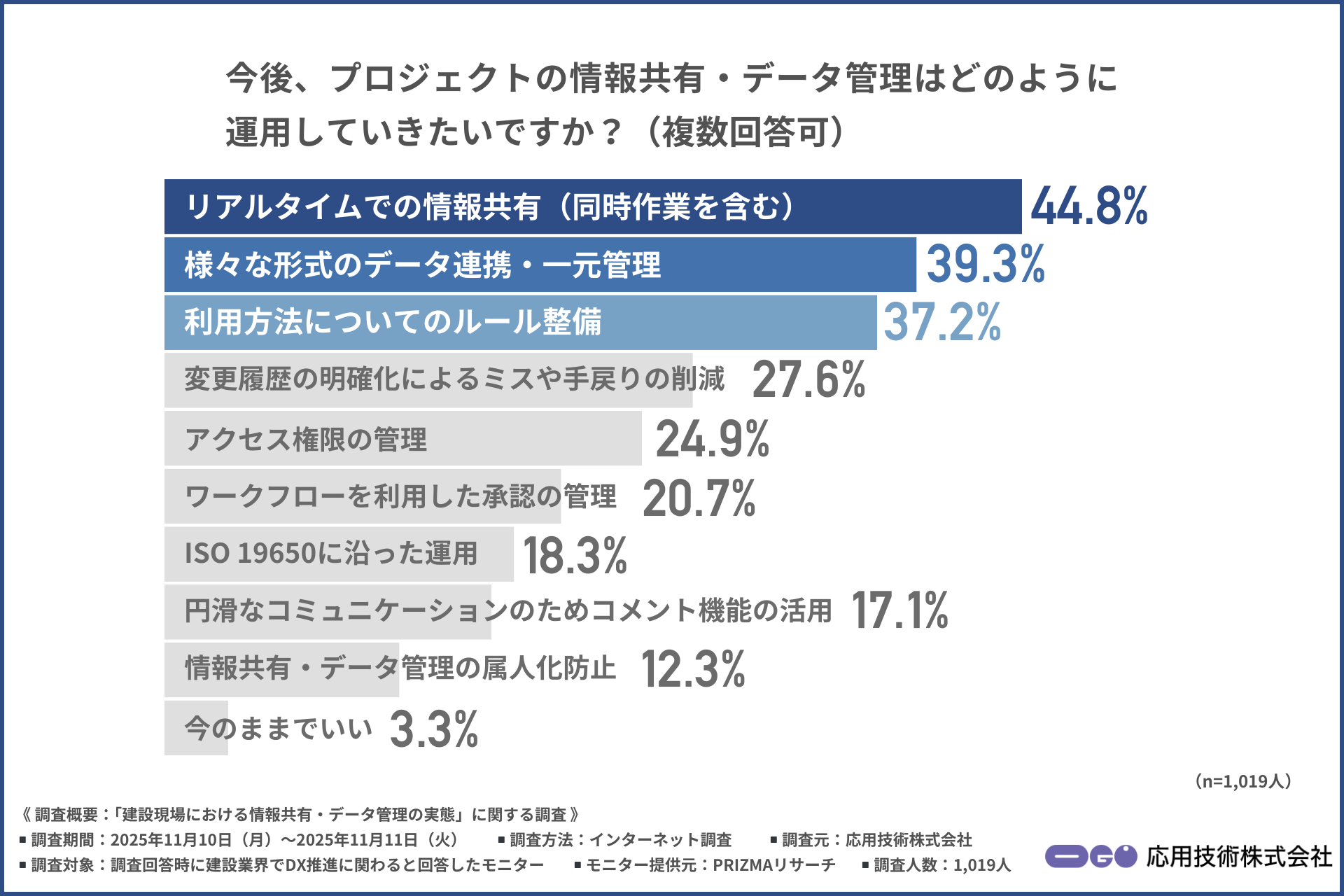 今後の情報共有データ管理の方向性としては、 「リアルタイムでの情報共有」や「データ連携/一元管理」を求める声が多い
