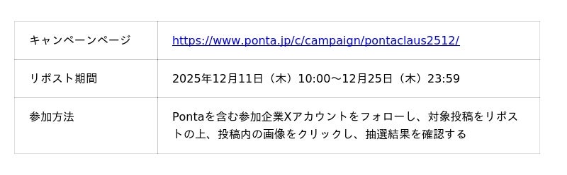 本キャンペーンには、参加アカウントをフォローし、「ポンタクロースのクリスマス2025」と記載された対象投稿をリポストの上、投稿画像をクリックすることで抽選に参加いただけます。当選された方には、Pontaポイントやコラボグッズなど、豪華賞品をプレゼントします。またWチャンスとして、参加条件を満たした方の中から、合計3,000名様に最大30,000Pontaポイントをプレゼントします。