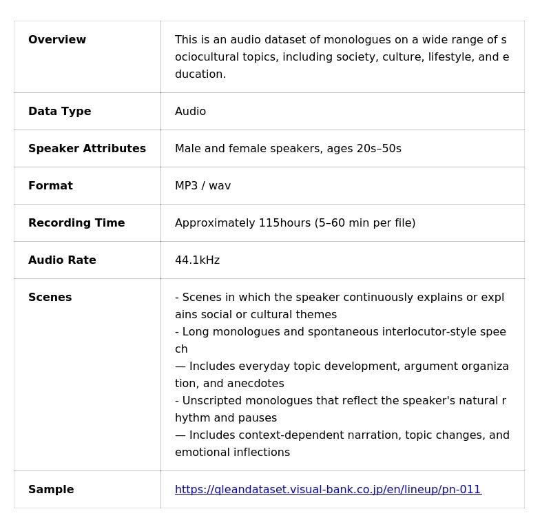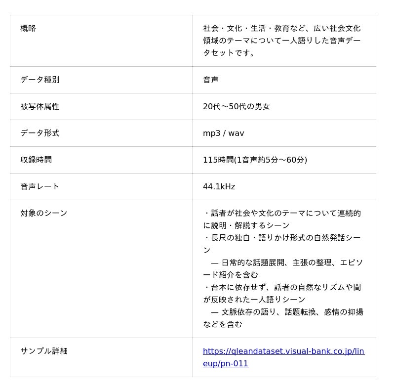 Visual Bank株式会社(東京都港区、代表取締役CEO 永井真之、以下「Visual Bank」)は、傘下の株式会社アマナイメージズを通じて展開するAI学習用データソリューション『Qlean Dataset(キュリンデータセット)』において、『日本語・1話者・社会/文化テーマトーク音声コーパスデータセット』の提供を開始しました。本データセットは、日常の出来事、家族や学校生活の思い出、価値観や気づきなど、身近なテーマについて話者が一人で語る音声を収録しており、音声認識(ASR)、自然言語処理(NLP)、生成AI基盤モデルなどの学習・評価に活用できます。
