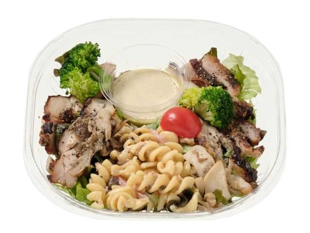 香ばしいグリルチキンと3種類のきのこ、マカロニを盛りつけした食べ応えのある華やかなサラダです。