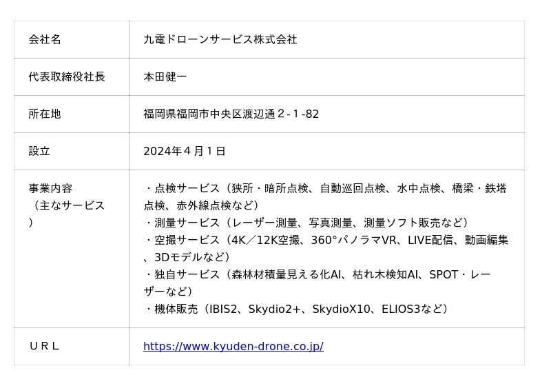 2024年4月設立。九州電力株式会社の社内設備点検でドローン・ロボットの活用に取り組み、豊富な機体とオペレータを保有。今後は全国の地域社会の課題解決に貢献していくため、従来のサービスメニュー(※以下のとおり)に加え、新たな点検・測量サービスの開発・提供や、特許取得済の独自ソフトの販売等を実施予定です。