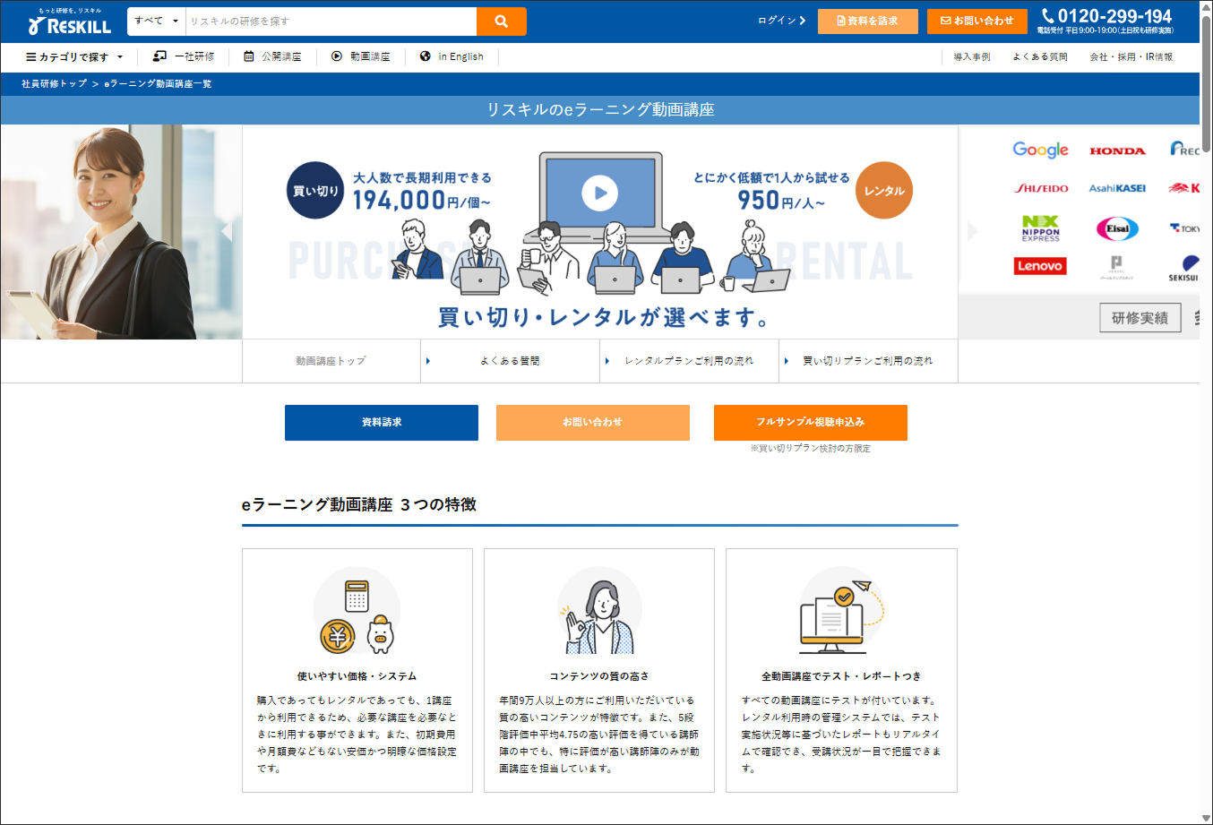リスキルのeラーニング動画講座は、eラーニング動画を視聴しながら実施する研修です。すべての講座が「買い切り」と「レンタル」の両プランに対応しており、柔軟な利用が可能です。