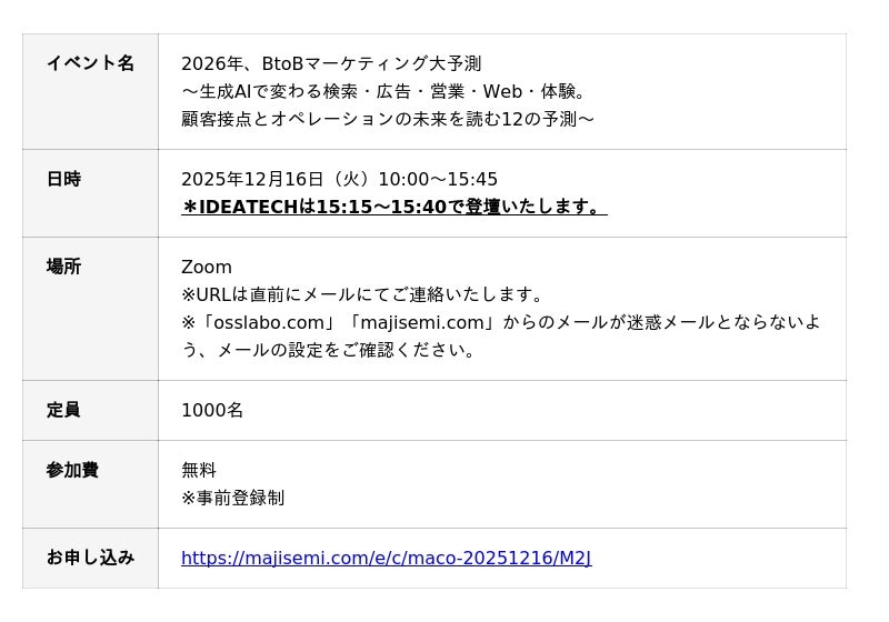 【IDEATECH、マジセミ主催セミナーに登壇|12月16日】生成AIで変わる検索・広告・営業の未来を読み解く「2026年、BtoBマーケティング大予測」カンファレンスに登壇