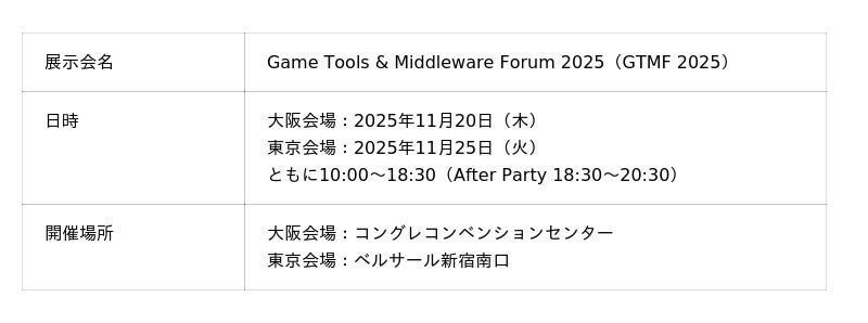 プロダクション現場で活用されているツールやミドルウェア、クラウドサービスを中心に、第一線で活躍する開発者・ベンダーが集まりました。会場では展示ブースやセッション、After Partyも実施され、最新の開発事例・運用ノウハウを共有する場となりました。