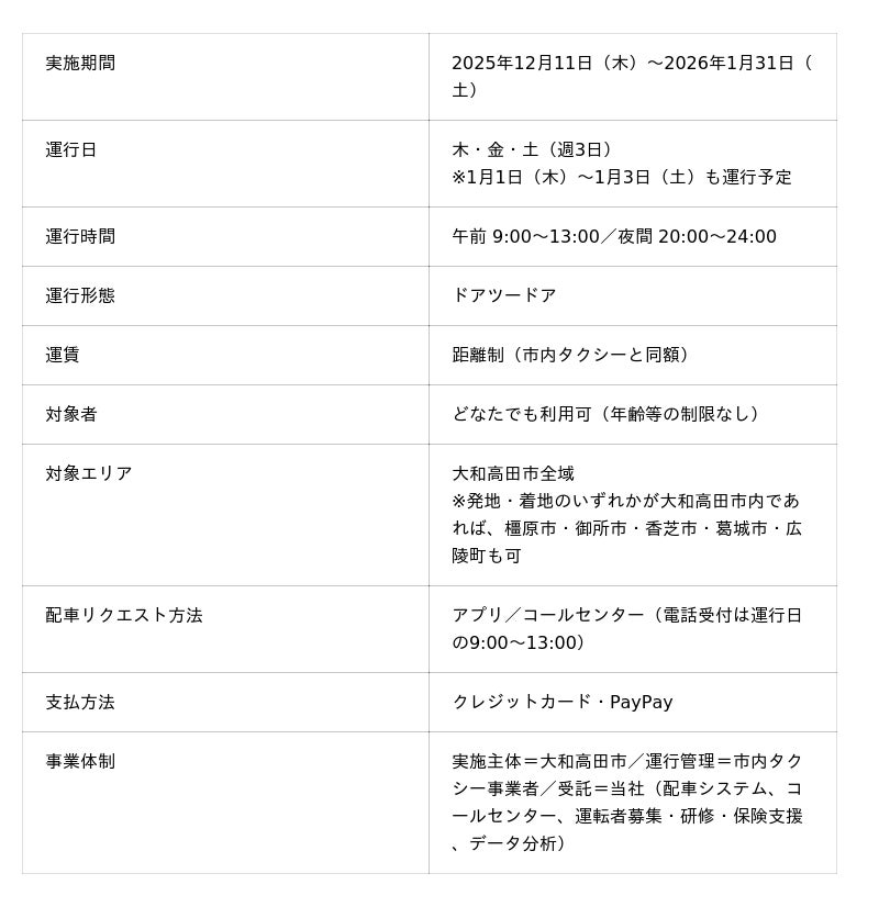 本事業の目的は、朝・夜間・週末のタクシー供給不足を補い、市民の移動手段を確保するとともに、時間帯別交通空白を可視化して将来の交通再編に資するデータを蓄積することです。対象は朝・夜間・週末の移動手段の確保が難しい市民を中心に、高齢者、駅利用者、買物・通勤・通院等に課題を抱える層まで幅広く想定しています。実施体制は大和高田市を実施主体とし、市内タクシー事業者が運行管理を担い、当社が配車システムの構築・運用、コールセンター、運転者募集・研修・保険加入支援、運行データ分析まで一貫して支援します。