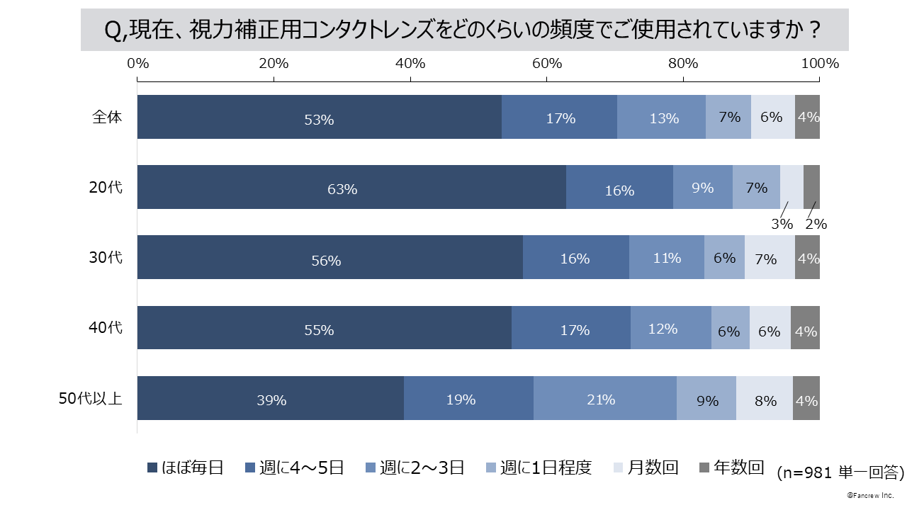 お客さまの声を最先端の分析でファン増加につなげる企業、株式会社ファンくる(本社:東京都千代田区、代表取締役社長:山口敬人)は、「ファンくる」会員を対象に、定期的に消費者の意識調査を実施しています。今回は視力補正用コンタクトレンズについて、使用頻度や、1か月あたりにかかる費用などを「ファンくる」会員981名(男性204名、女性777名)に調査を実施しました。