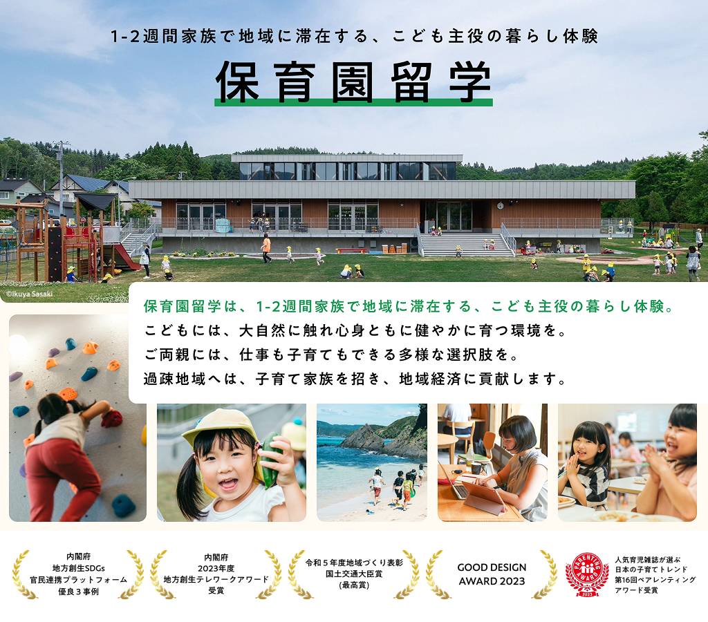 1-2週間家族で地域に滞在する、こども主役の暮らし体験「保育園留学」は「第5回日本サービス大賞」優秀賞・審査員特別賞、人気育児雑誌が選ぶ2023年の日本の子育てトレンド「第16回 ペアレンティングアワード」、内閣府「地方創生SDGs官民連携プラットフォーム」優良3事例、内閣府「2023年度地方創生テレワークアワード・地域課題解決プロジェクト参画部門」、国土交通省「令和5年度地域づくり表彰」国土交通大臣賞(最高賞)など多数受賞。