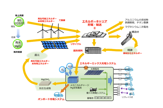 今回、レースに挑んだのは、マグネシウムを燃料として用いた「マグネシウム空気電池」に太陽電池を組み合わせた、独自開発のハイブリッド・ソーラーカー「S-Mgコンセプト」です。マグネシウムは海水から製錬でき、さらに発電後の副生成物を再精錬すればマグネシウムに還元されるため、資源循環型エネルギーとして期待されています。また、再生可能エネルギーである太陽電池は日射状況によって発電が変動するため、マグネシウム空気電池でそれを補う環境負荷の少ないエネルギーミックス型充電システムを具現化しました。マグネシウム空気電池を使った国産初の新型ソーラーカーは、市街地や離島での利用を想定した小型で環境に優しい次世代モビリティとして、国内外から注目されています。