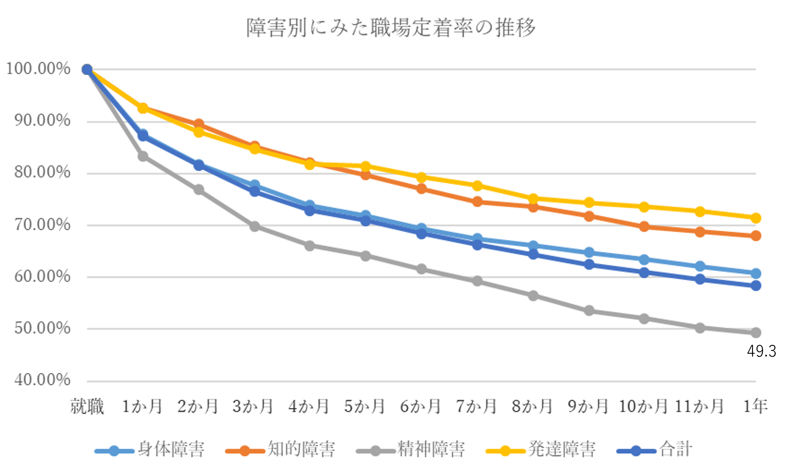 定着率においても、精神障がい者の約5割が1年で会社を退職する状況となっています。