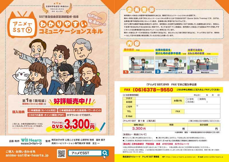 また、知的障がいや発達障がいのある方が、アニメ動画を通じて主体的にコミュニケーション能力向上に取り組める、学習用DVD『アニメでSST』 の制作・販売も行っています。