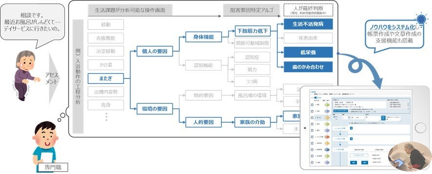 「ハレクルWith®」は、日常生活での支障やその兆しを具体的な工程の場面で捉え、その原因を分析結果として自動提案し、地域包括支援センターの職員が行うアセスメントや報告書の作成、予防プランの目標設定を支援します。たとえば「お風呂に入るのが大変」という場合も、浴室までの移動、浴槽をまたぐ、体を洗う――といった工程に分解。どこに課題があるのかの分析をICTが支援し、改善に向けた目標設定に導きます。