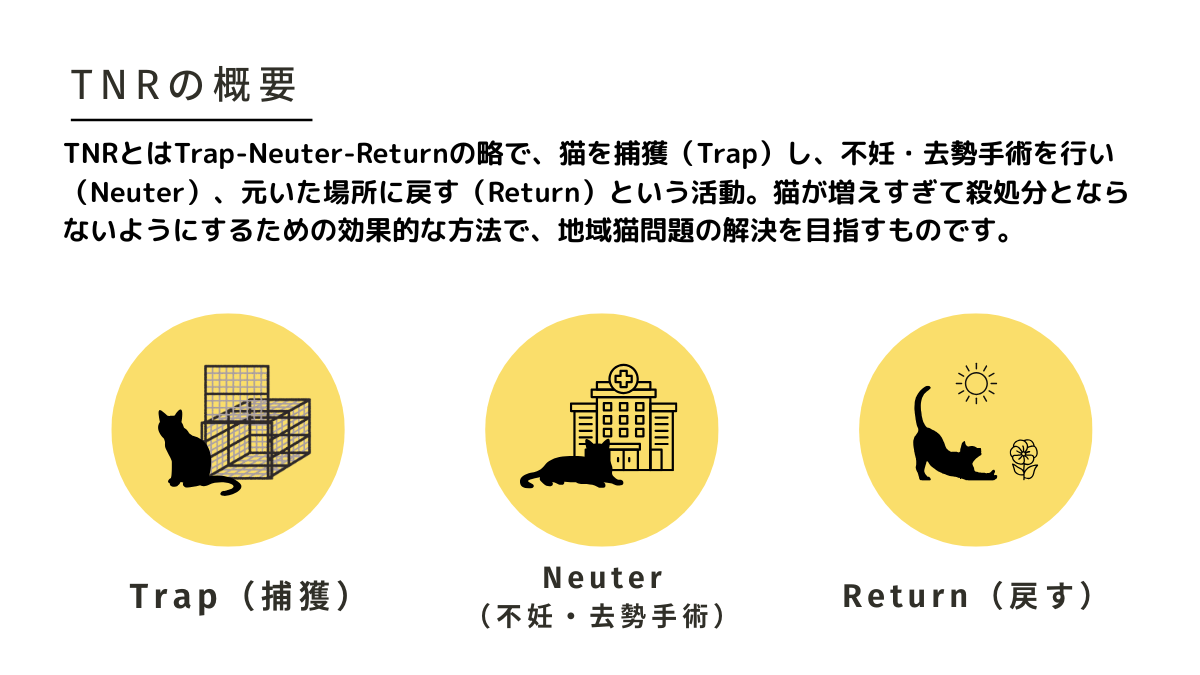 ※TNRとは、Trap-Neuter-Returnの略で、猫を捕獲(Trap)し、不妊・去勢手術を行い(Neuter)、元いた場所に戻す(Return)という活動。猫が増えすぎて殺処分とならないようにするための効果的な方法で、地域猫問題の解決を目指すものです。