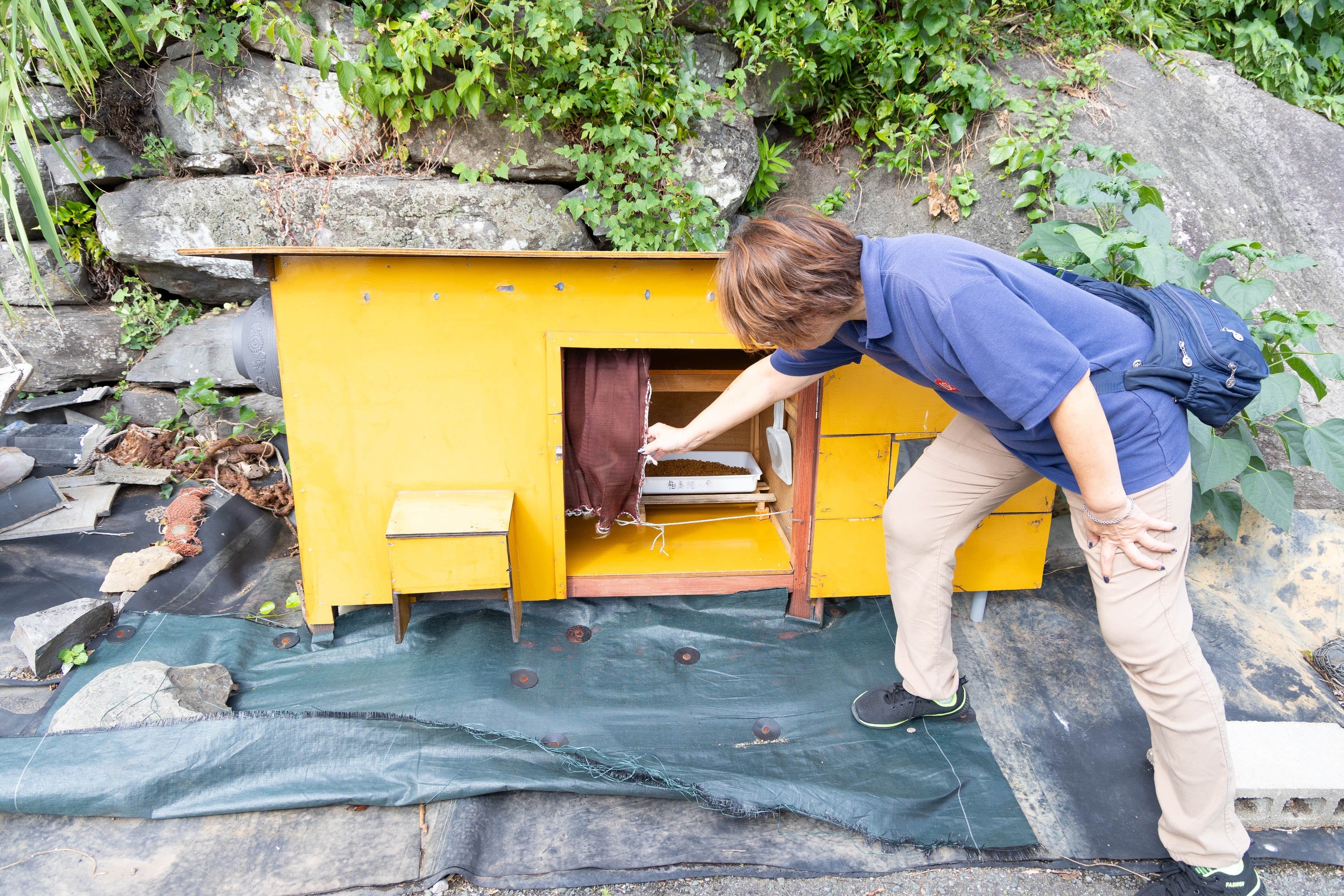 「島のいくつかの飲食店はレジ横に募金箱を置いてくれています。フェリーの船員さんは、重いフードの荷物などを運んでくれる。あと、猫食堂を単に作るだけじゃなくて、風よけを設置したり、雑草が生えないように防草シートを敷いたりと、いろんな工夫を凝らして手伝ってくれる方もいます。こういう方たちのおかげもあって、相島の猫たちの安全が守られているんです。」