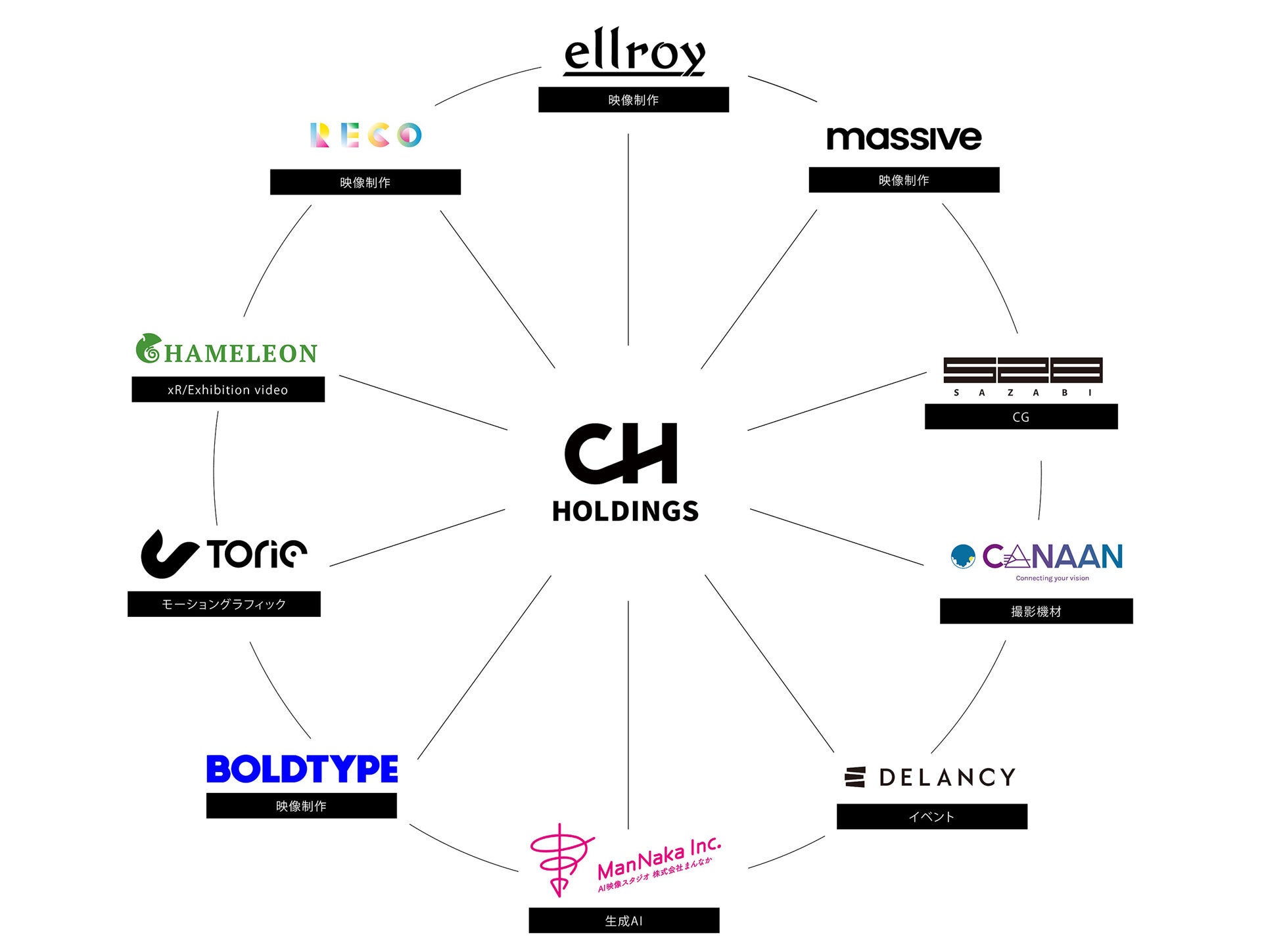 「CHは、一般的な映像制作から3DCGやライブ配信、AR、XR、VR、ドローン撮影、スチール、デザインやプランニングという映像制作のほぼすべてを担える67名、12役職を抱えていて、映像制作に関するソリューションをすべて提供・提案できるのが強みです。10社が映像制作の種類だったり、価格の幅だったり、役職の幅を補完しあって一気通貫体制を構築していますが、この中でも、1社で幅広くフレキシブルに対応できるのがRECOだと思っています」