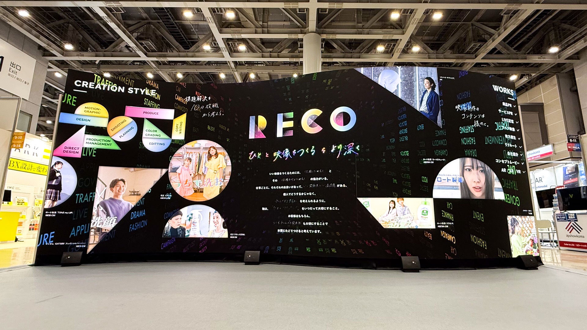 「RECOはクライアントさんに企画からご提案することができるので、クライアント直の仕事を増やしたいという発想で出展を決めました。あのイベント自体がそういう狙いのものなので。また今回、ヒビノビジュアルから大型映像演出の協力を得られたことで、制作の領域がテレビやウェブCMなどの域を超え、イベントに絡む映像やコンサート映像まで手掛けていることも、エンドクライアントさんにより伝わったと思います」