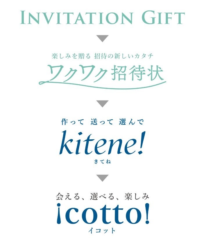 だから、さすがに諦めるか…と見直すことになり、最終的に「icotto!(イコット)」になりました。kitene!は新郎新婦側の気持ちを表現したものですが、icotto!はゲスト側の気持ちを表現したものです。招待状をもらって「行こっと!」って。