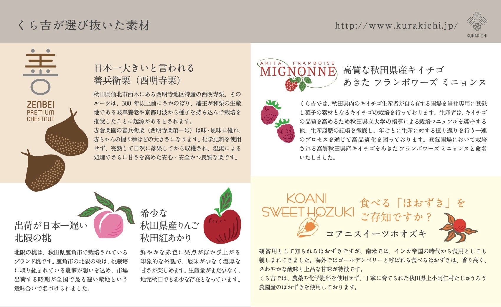 くら吉は地域の素材を再発見し菓子として提供することで、地域の生産者と全国の消費者をつなぐ役割を果たしております。