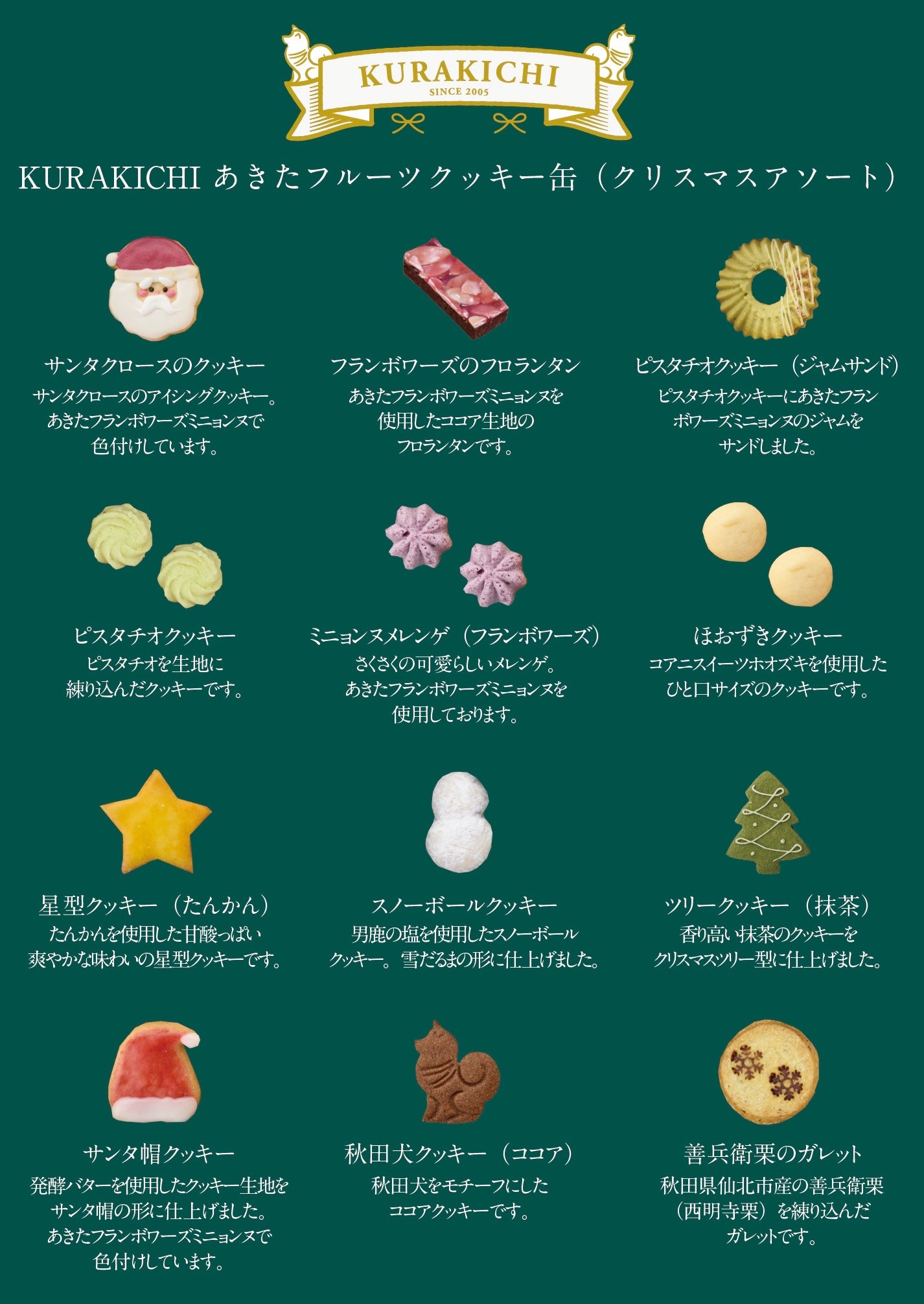 くら吉は素晴らしい地域素材を見つけ出し、その個性を最大限に生かす菓子創りを行っております。今回新たに発売するKURAKICHIあきたフルーツクッキー缶(クリスマスアソート)は、そうした従来の開発スタイルから一歩踏み出し、地域素材から商品開発を発想するのではなく、クリスマスという特別なオケージョン(贈り物のシーン)を起点に、くら吉の強みである地域素材の魅力を反映させて開発を行なった、新しい挑戦に取り組んだ商品となります。