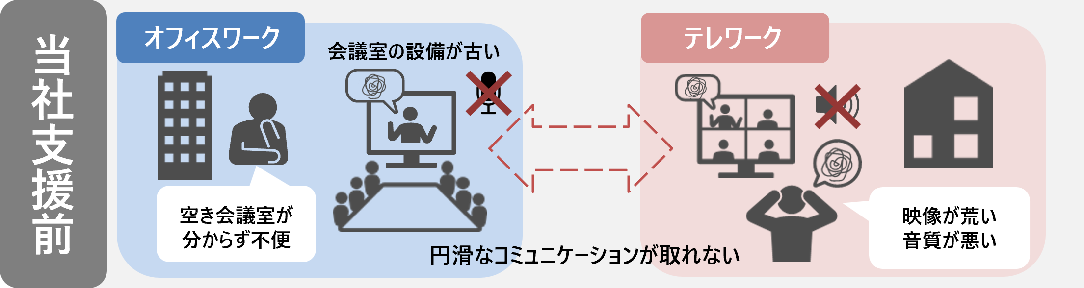 オンライン会議では、相手の表情や状況が見えにくいため、映像・音声の品質が会議の満足度に大きく影響します。しかし多くの企業では、会議設備の老朽化による音声の途切れやタイムラグといったオンライン会議特有の問題に悩まされています。さらに、会議室の利用状況をリアルタイムで把握しづらいなど、これらの課題は従業員のストレスや業務効率の低下を招くとともに、顧客対応や社内コミュニケーションの質にも悪影響を及ぼしています。