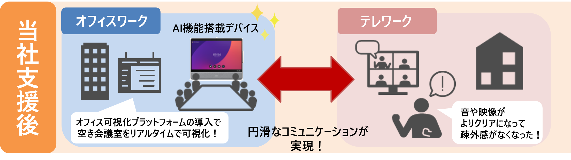 このように最適な会議環境が整うことで、オフィスにいる従業員とテレワークで働く従業員が物理的な距離を感じることなく、スムーズで円滑にコミュニケーションを取れるハイブリッドワーク環境が実現します。これにより、従業員の一体感が強化され、意思決定の迅速化や業務効率の向上が期待できます。