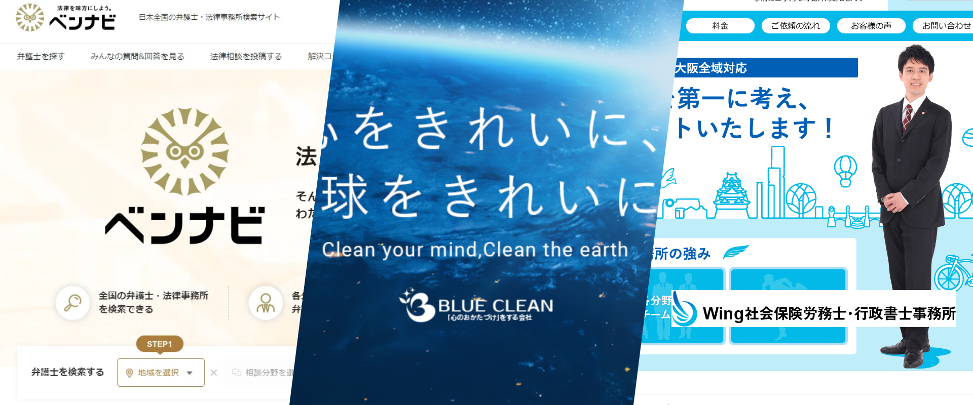 ※左から「ベンナビ」、「ブルークリーン」、「Wing堂ヶ芝行政書士事務所」