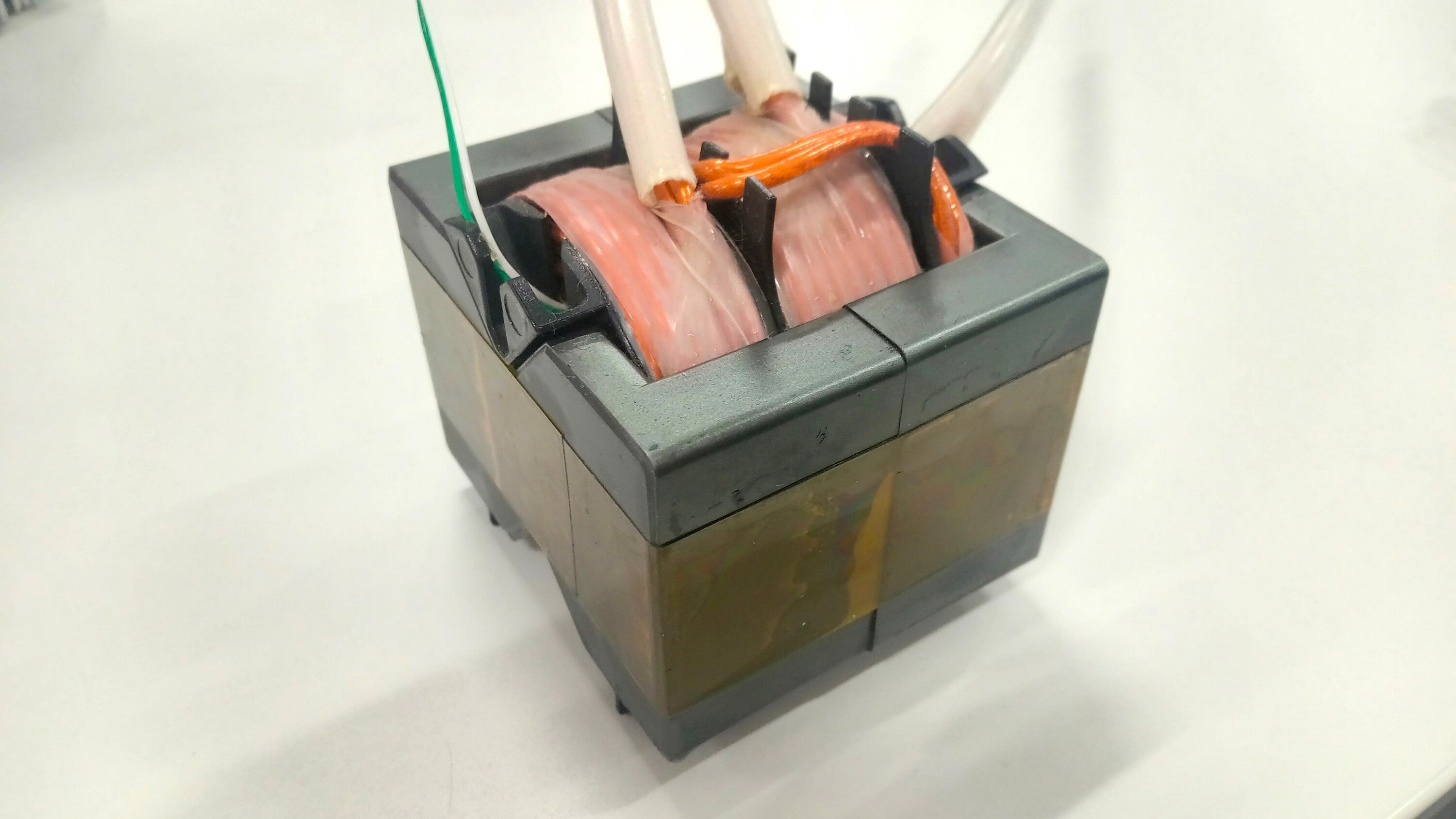 田内:市場には既にEVの電気を自宅とつなぐV2H(Vehicle to Home)は存在していましたが、パワコンのサイズが大きく、設置制約があるという課題がありました。パワコンの小型化を実現するためには、電気回路において電圧や電流を変換したり、電気的に絶縁したりするための部品である「トランス」の小型化が不可欠でした。一般的にトランスはパワコンの部品の中でもサイズが大きく、これを小さくするには高周波化が鍵となります。しかし、高周波化すると回路損失が増加し、結果として発熱が大きくなる懸念がありました。そのため、放熱器のサイズを大きくする必要があり、小型化の障壁となっていました。