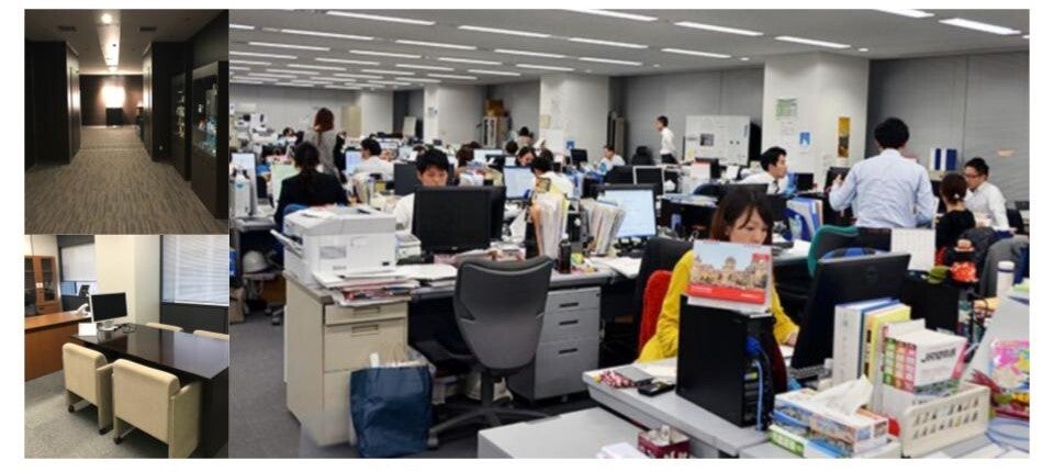 (写真)旧社名時代の様子。左上から時計まわりに、エントランス、管理職席が設置されている島型レイアウトの執務スペース、社長室。
